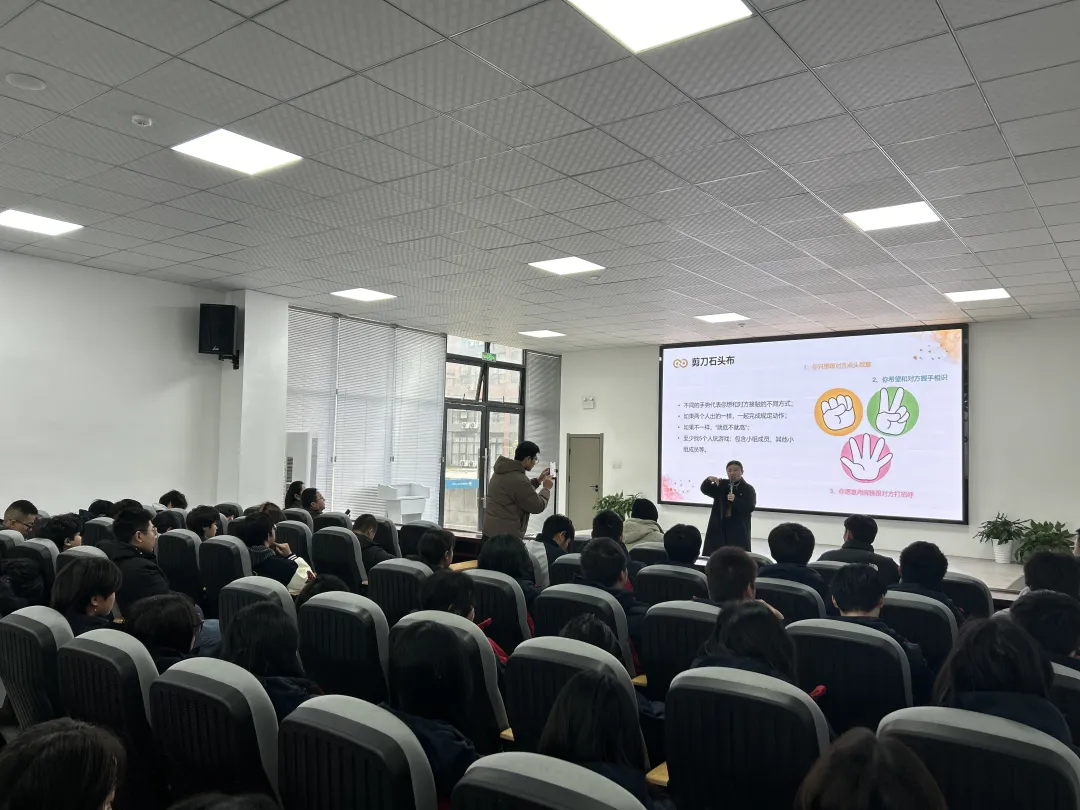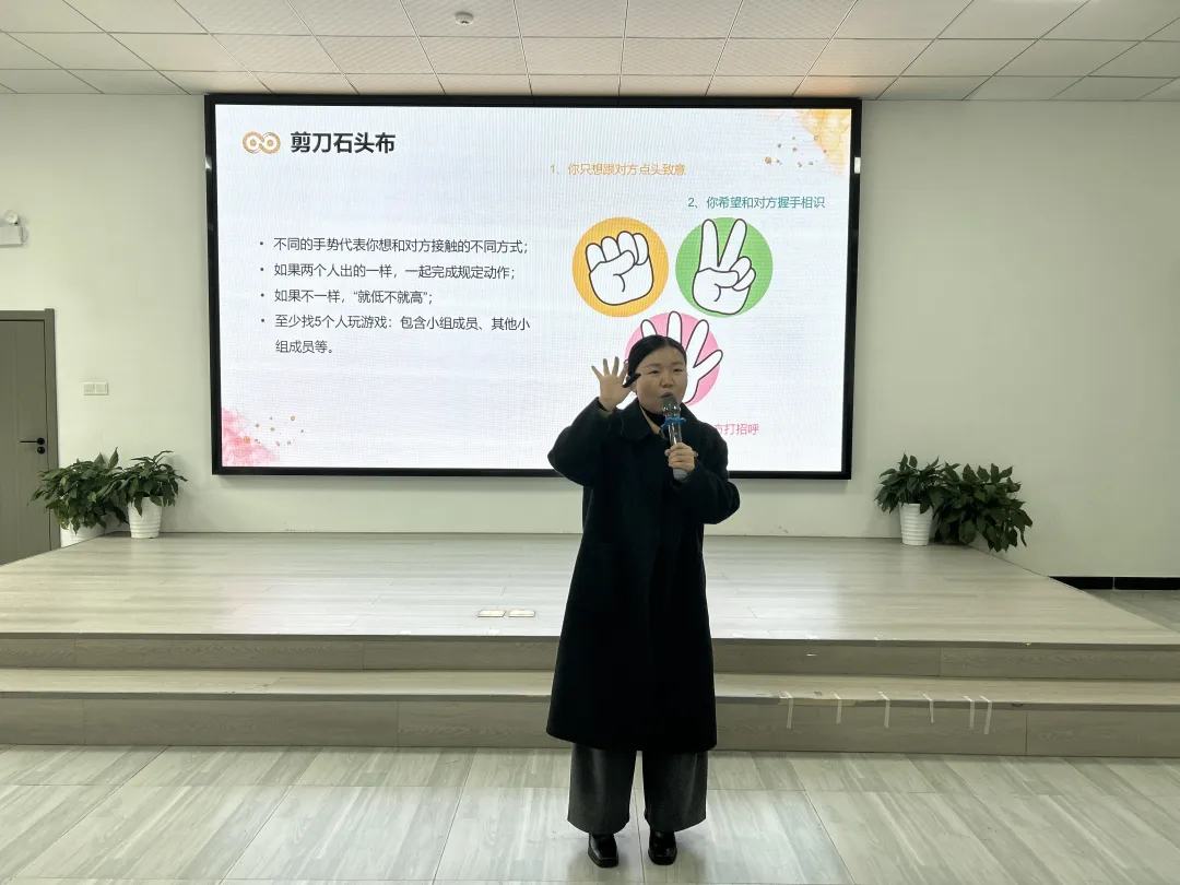 讲座伊始,汪老师用简单的“石头剪刀布”破冰小游戏迅速点燃现场气氛。她详细讲解了游戏规则:不同的手势代表着想与对方接触的不同方式;若两人出拳一致,便一同完成规定动作;若出拳不同,则遵循“就低不就高”的原则温和互动;同时要求大家至少与5位同学完成游戏,既可以是同组伙伴,也可以是其他小组的同学。