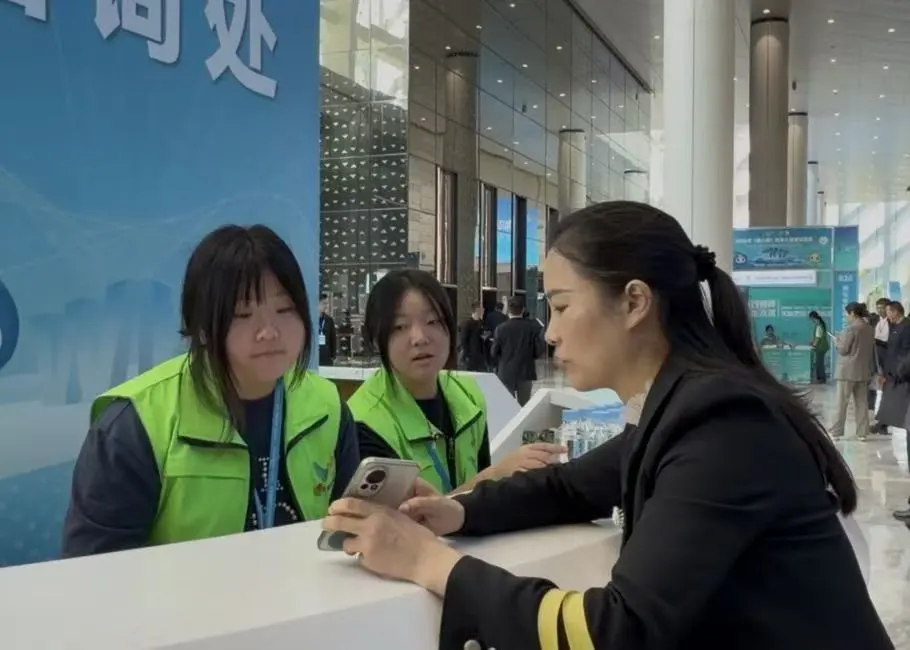 展馆咨询台内,志愿者们主动对接嘉宾需求,提供答疑引导、行李寄存、展会手册发放等一站式服务,用温暖细节传递贴心关怀,展现出城铁学子的良好风貌。