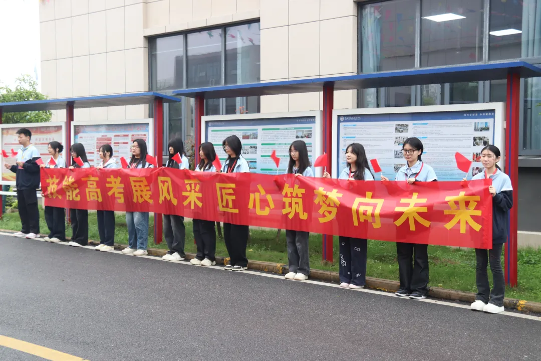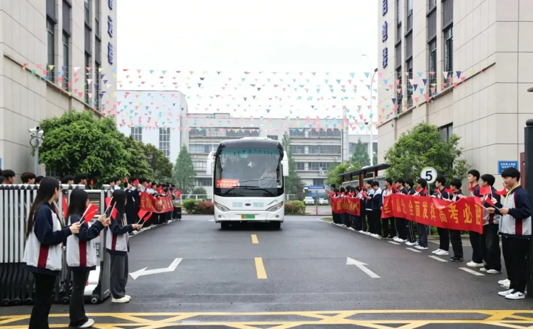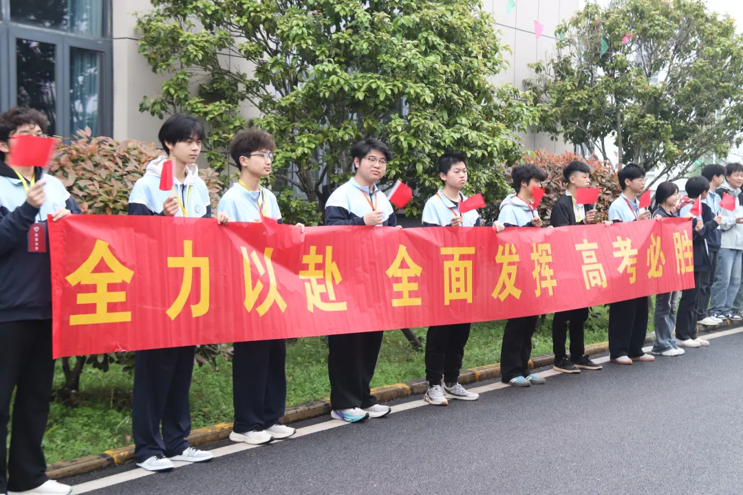 送考现场还有一道温暖的风景——学校24级、25级的同学们面带笑容,手持红旗、牵着祝福横幅,整齐列队目送送考车辆。他们用最真挚的方式为学长学姐们加油鼓励,定格下校园里温暖的动人瞬间。